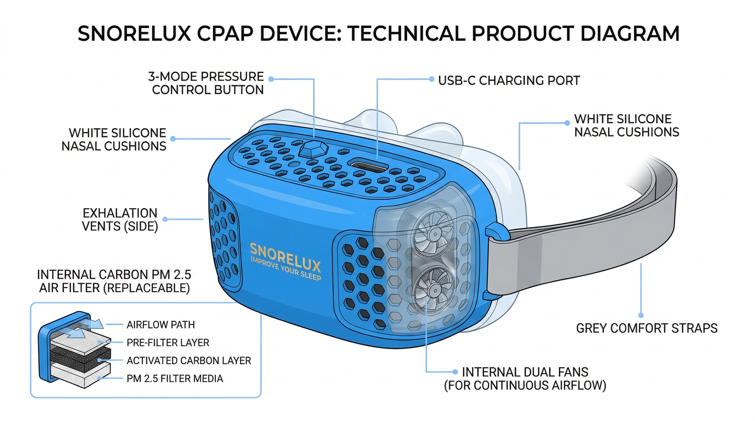 Snorelux mini-CPAP device uses dual high-power fans to deliver continuous positive airway pressure directly to your nasal passages, keeping airways open all night. The ultra-fine PM 2.5 carbon filter ensures clean, purified air while the 3-mode pressure control lets you customize airflow intensity. No more bulky machines—just silent, effective snoring prevention in a compact, travel-ready design.