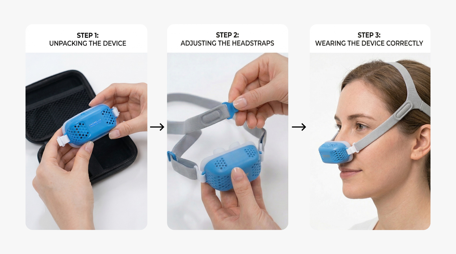 Using Snorelux Pro is incredibly simple. Just unpack the compact device from its travel case, pick and adjust the soft headstrap for a perfect fit, and gently position it in your nostrils, press the button ( level 1 turns on ) , done. No complicated machines, no bulky equipment – just effortless comfort and quiet, restful sleep in seconds. Perfect for home or travel.